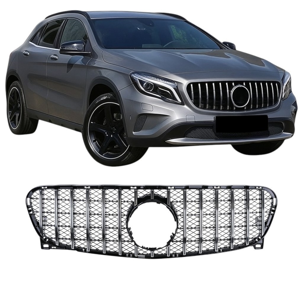 De sport grille Mercedes GLA X156 2013-2016 in volledig glanzend zwart met chromen verticale lijnen geeft jouw auto een moderne, krachtige en exclusieve uitstraling. Dankzij het ontwerp met verticale lijnen krijgt jouw Mercedes-Benz GLA een sportieve en elegante look.